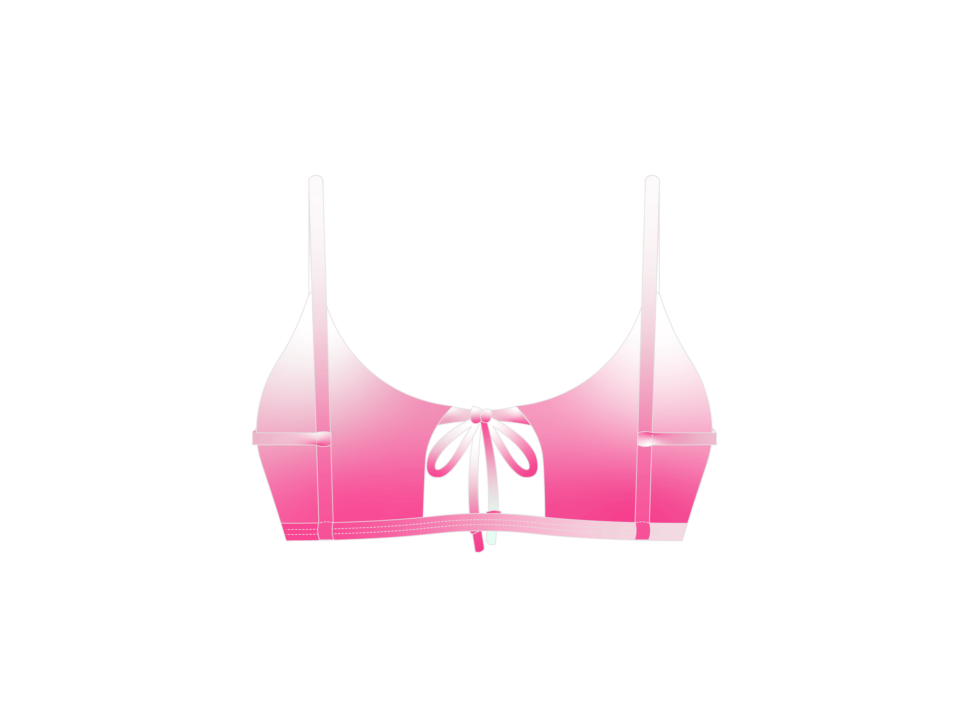 This open front style top boasts a fun. vibrant solid embroidered logo that is sure to turn heads. With a tie in the front that adjusts the straps. and an Ombre design fading from white to pink. This top is the perfect blend of style and function. complete it with the matching Dainty Bottoms.