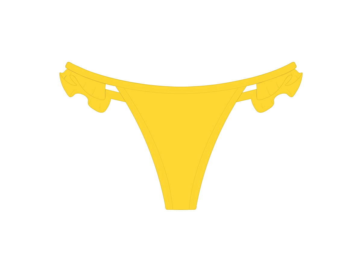 The ultimate string bikini bottom: teeny tiny with a continuous forgiving single strap with epic ruffles at the sides connecting front and back. while providing plenty of desirable cheek peek. This already elevated pool and beach look comes to life when paired with its matching top!
