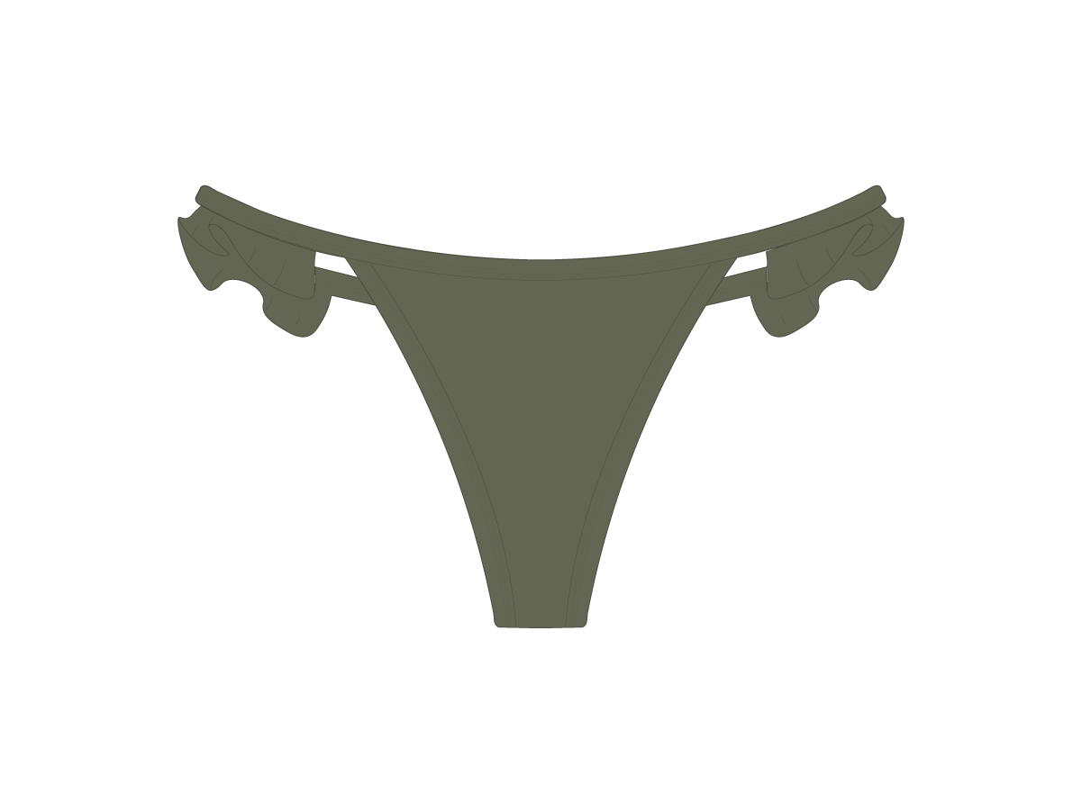 The ultimate string bikini bottom: teeny tiny with a continuous forgiving single strap with epic ruffles at the sides connecting front and back. while providing plenty of desirable cheek peek. This already elevated pool and beach look comes to life when paired with its matching top!